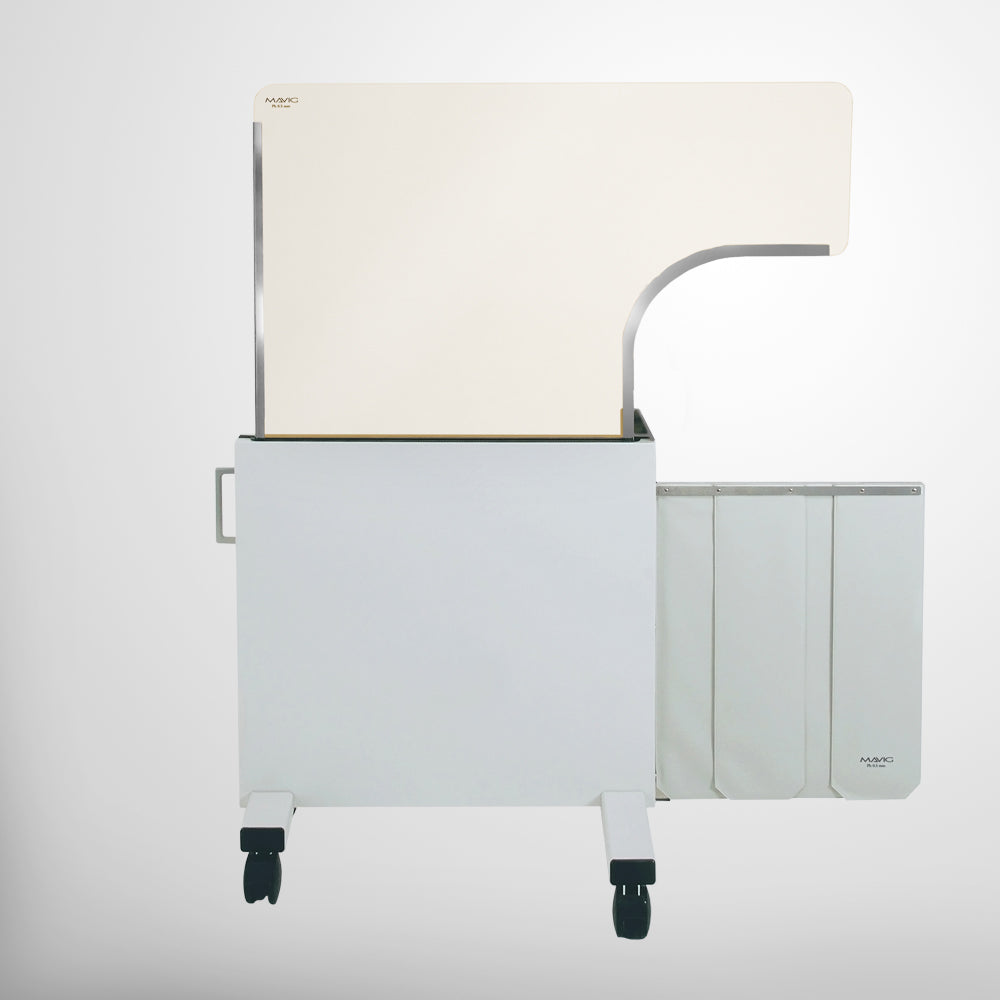 The height-adjustable mobile shield with a special contour cut-out and additional lower, radiation protective strips can be placed over the body of the patient, effectively reducing secondary radiation emanating from the patient’s body.